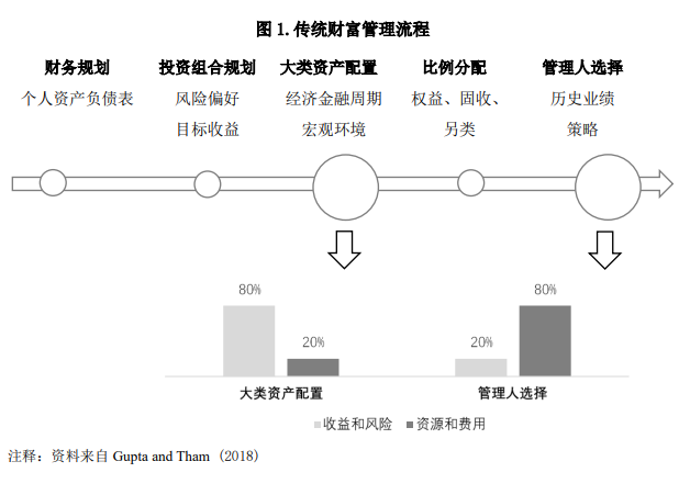 然而,目前的投资过程中,超过80%的人才、资源和成本用在了管理人或投资策略的选择上,仅有剩下不到20%用在了资产配置决策上。可见这种重产品轻配置的投资理念亟待转变。智能投顾以被动投资为主,通过指数基金和指数ETF等低费率的金融产品来组建投资组合,重配置轻产品,是财富管理转型的重要抓手。