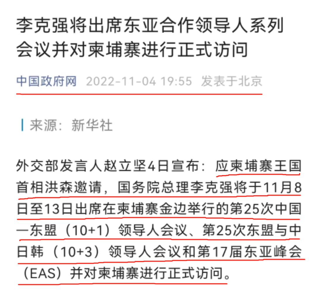 本月4日,中国正式发布“李克强总理出席东亚合作领导人系列会议并对柬埔寨进行正式访问”的消息。从消息中可以看出,中国总理在柬埔寨期间的时长达5天,并且会出席一系列活动。