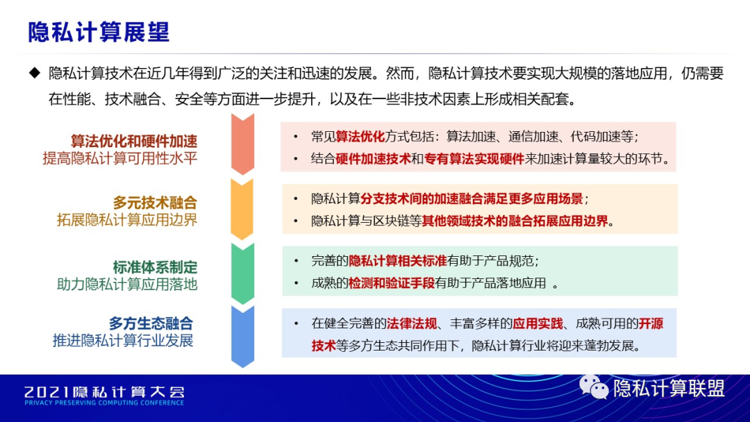 隐私计算技术近几年得到广泛的关注和迅速的发展。然而,要实现大规模落地应用,仍需要在性能、技术融合、安全等方面进一步提升,以及在一些非技术因素上形成相关配套。