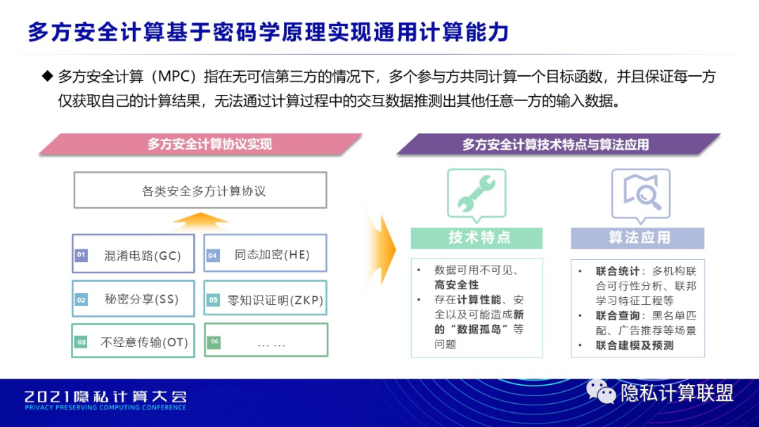 多方安全计算(MPC)技术源于姚期智院士的百万富翁问题,是多种密码学基础工具的综合应用。MPC可以使多个非互信主体在数据相互保密的前提下进行高效数据融合计算,因此可实现“数据可用不可见”,具有很高的安全性。但是多方安全计算也面临一些问题,例如:密码学复杂的运算过程造成的计算性能问题,安全问题,不同技术间的加密数据不能互通造成的新的数据孤岛问题等。目前,MPC技术广泛应用于联合统计、联合查询、联合建模、联合预测等场景。