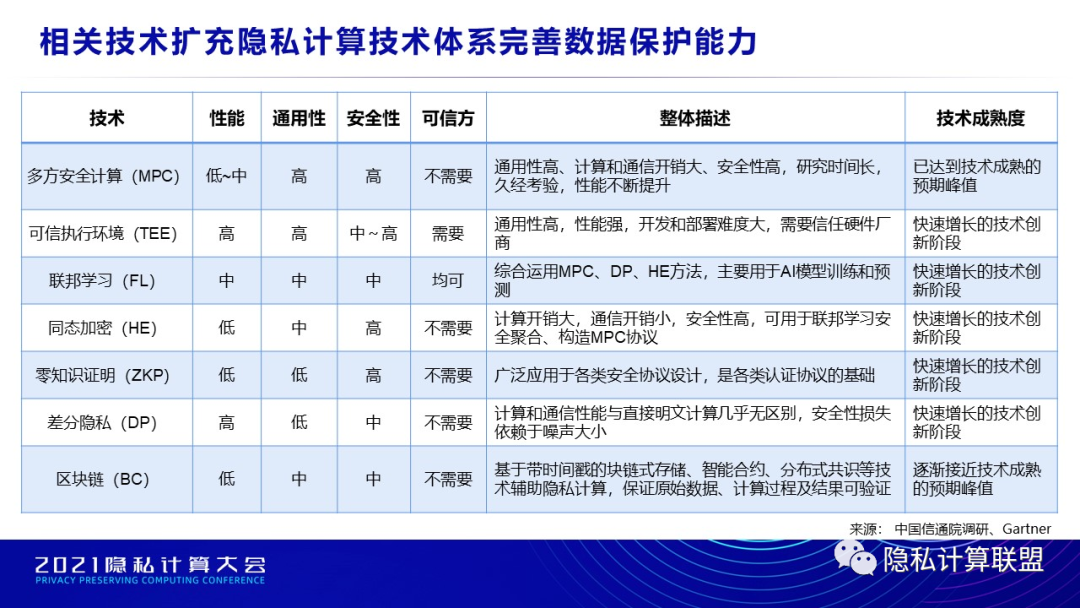通过对隐私计算技术观察以及产品测试,给出了主要技术对比。技术成熟度部分引用了Gartner的观点。