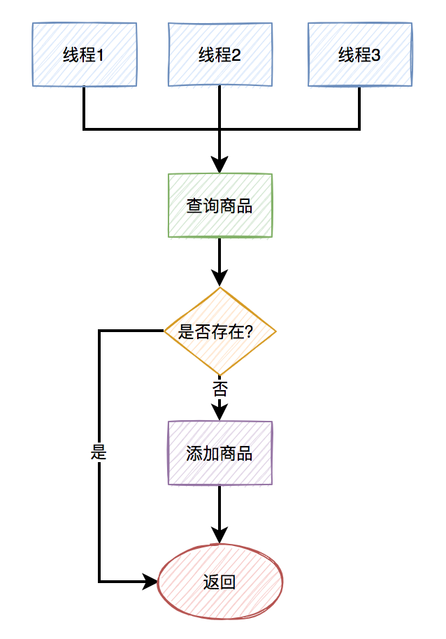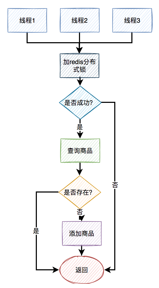 主要流程如下:可以在复制添加商品之前,先尝试加锁。如果加锁成功,则在查询商品是否存在,如果不存在,则添加商品。此外,在该流程中如果加锁失败,或者查询商品时不存在,则直接返回。