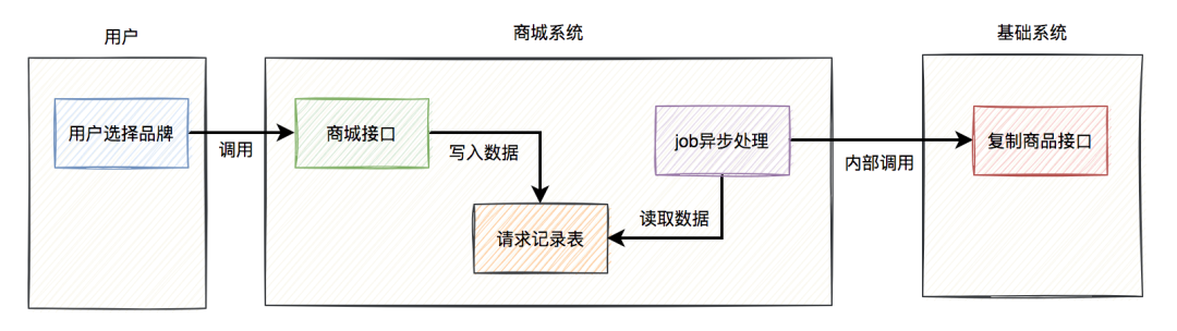 请求记录表中写入一条数据,然后在另外一个job中,异步调用基础系统的接口去复制商品。