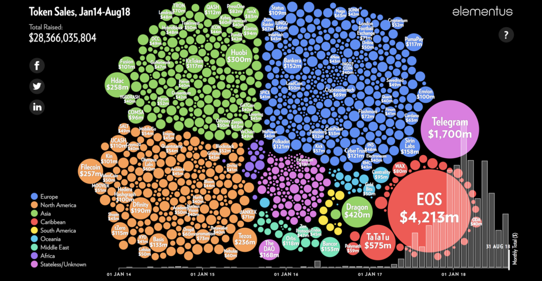 据相关数据统计,仅2017年,就有875个项目通过ICO筹集了超过60亿美元的资金。而在2018年仍有有1253个项目方通过ICO筹集了大约80亿美元。