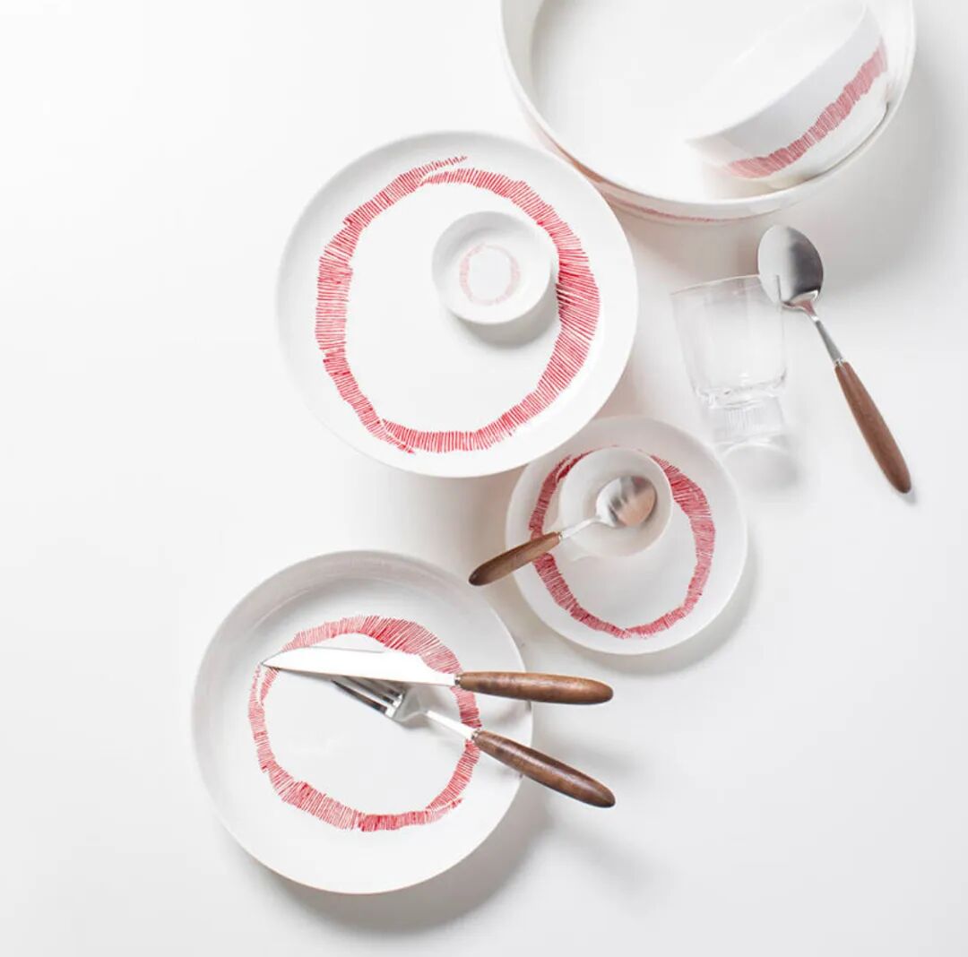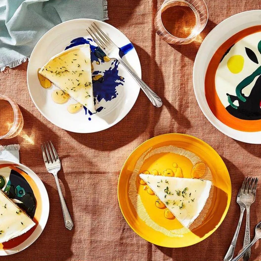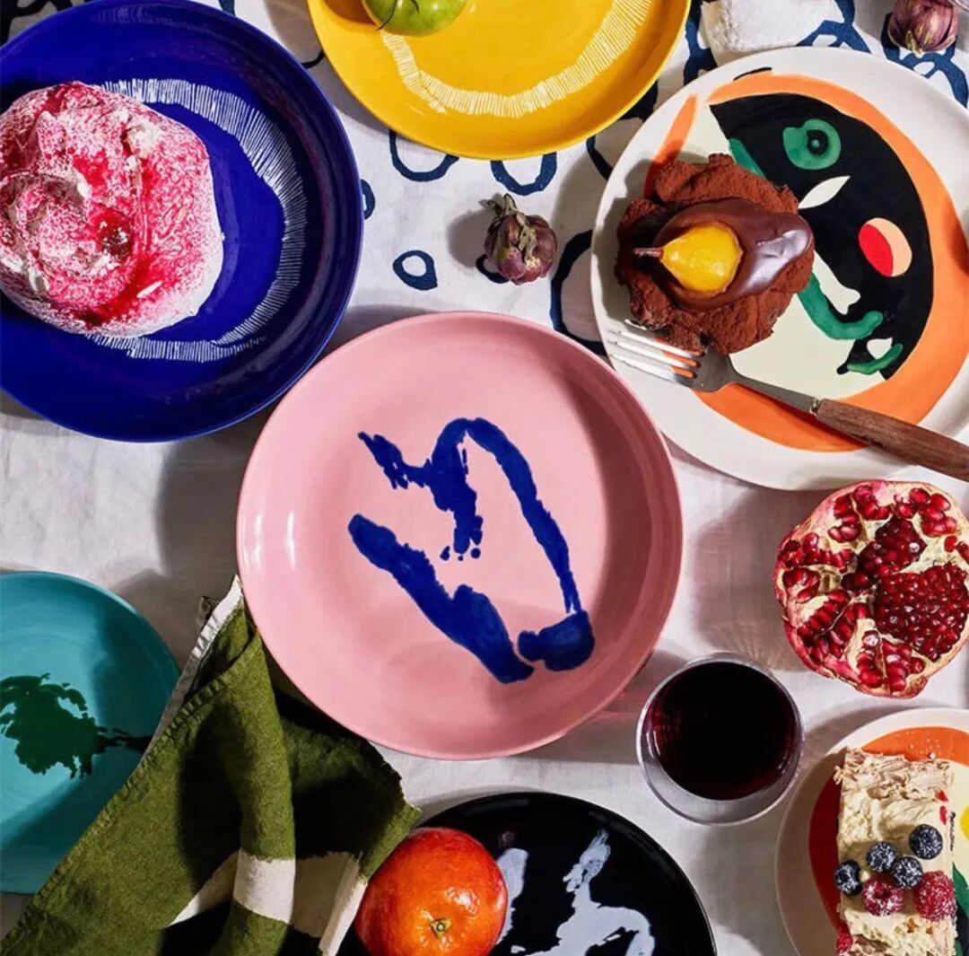 比如英籍以色列厨师Yotam Ottoleghi与意大利艺术家Ivo Bisignano合作的Feast系列旋涡盘,以白色、宝蓝、明黄、红色为主色调,绘有艺术家的彩色笔触。