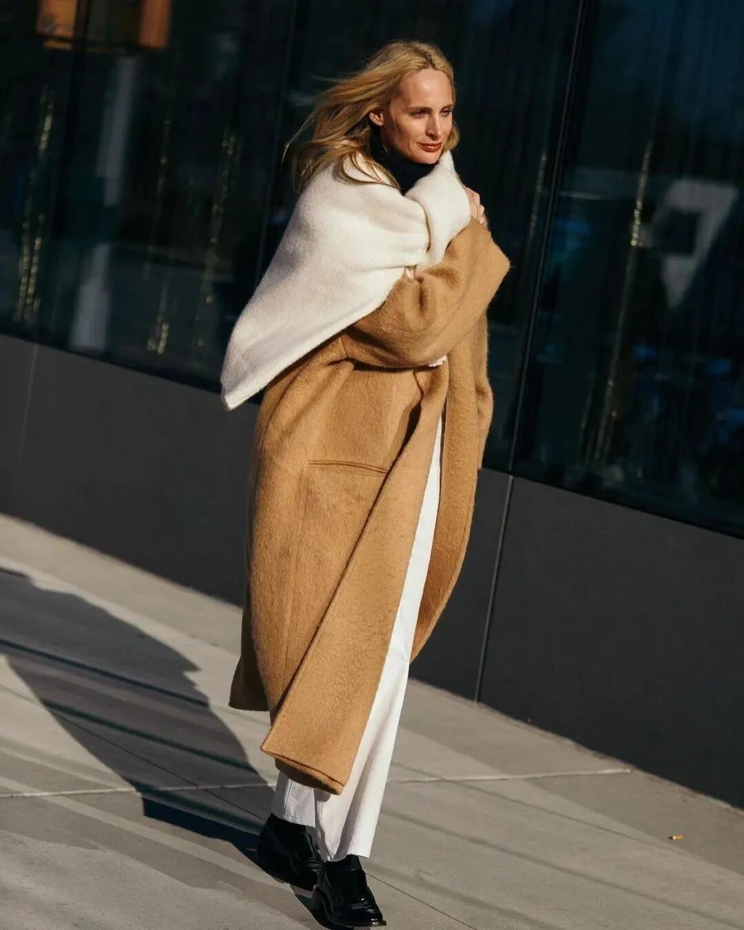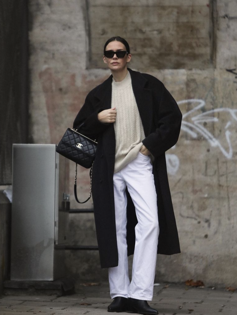 生活在斯德哥尔摩(气温0度左右的城市)的博主Caroline Blomst,冬天总喜欢穿一条宽松的白色牛仔裤,它自然是没有黑裤子显瘦,可黑裤子也没有它的轻盈柔和。