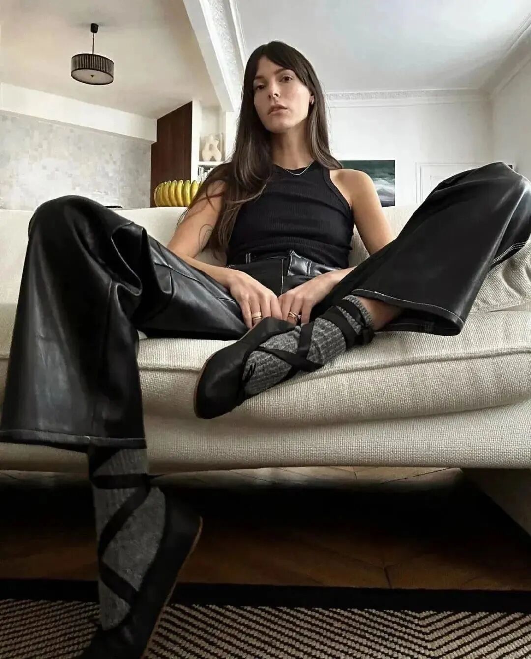 这种穿法不仅属于亚洲, 博主Tine Andrea和Leia Sfez也会大方地露出芭蕾鞋里的棉袜,融入在她们经常会穿的all black look中,有了日常单品的保驾护航,芭蕾鞋也能优雅落进日常里。