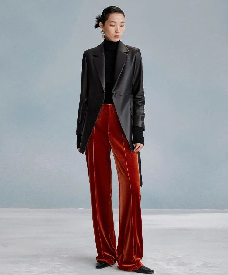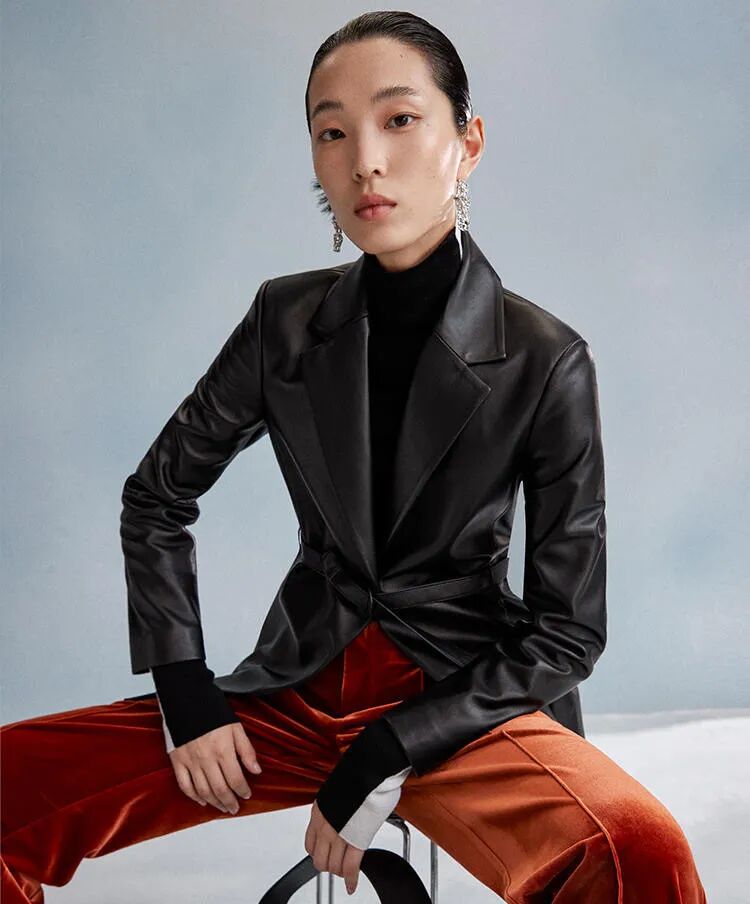 皮质的特殊性,也会比西装面料更显英气,但也不用担心穿着不舒服的问题,绵羊皮非常柔软反而越穿越随身,有潜力危及你衣橱里最爱的那件西装的地位哈哈,是现代都市女性会中意,也能经常穿得上的单品。