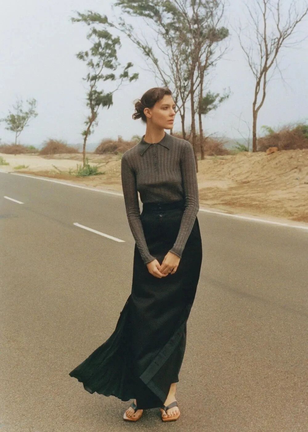 Anouk Yve身上的衣服是极致简约的,但总体又不至于“性冷淡”有距离感,有种女人味的、优雅的气息浮现,因为她选择的鞋子都有这种特质,包括芭蕾鞋。