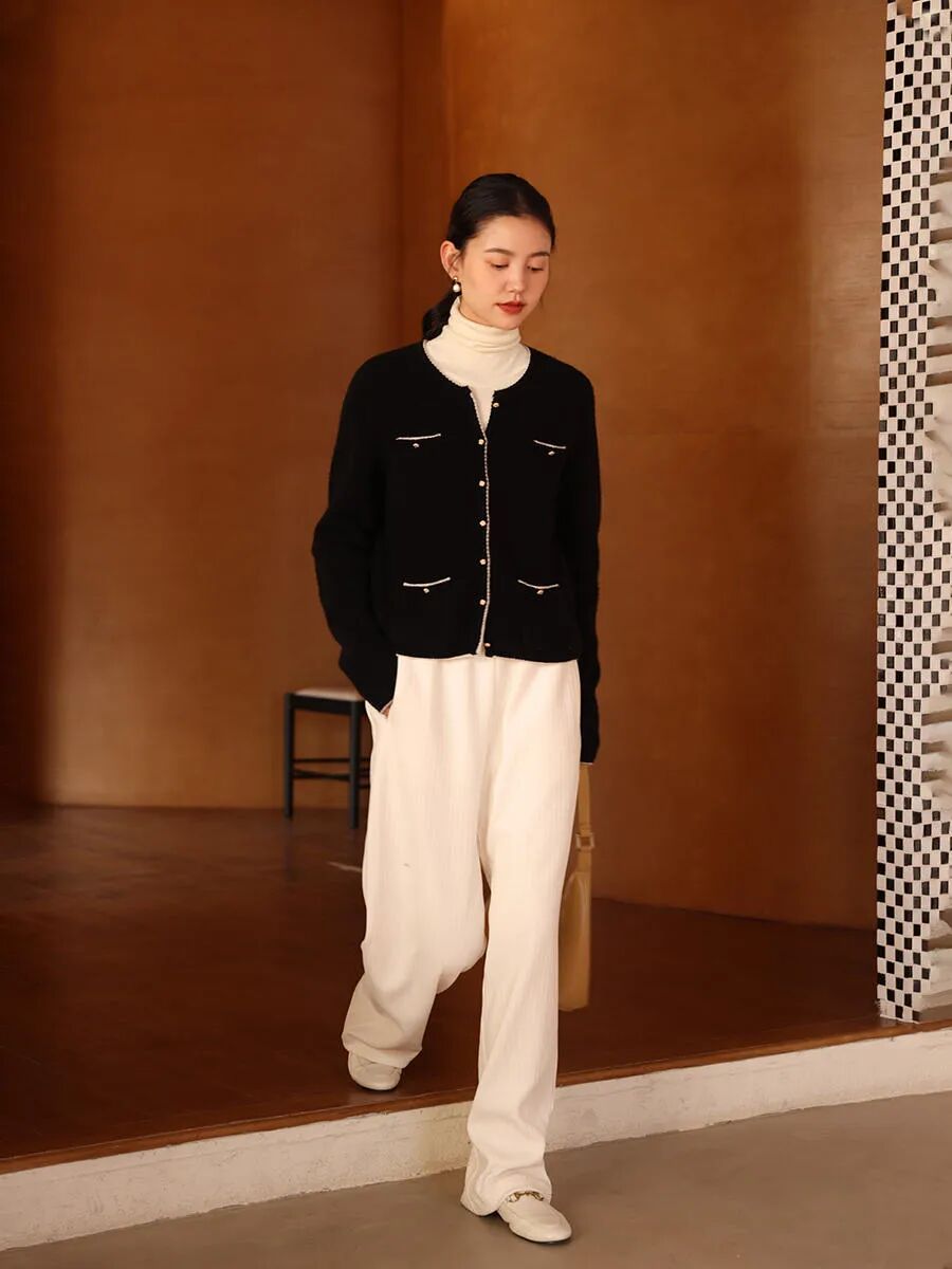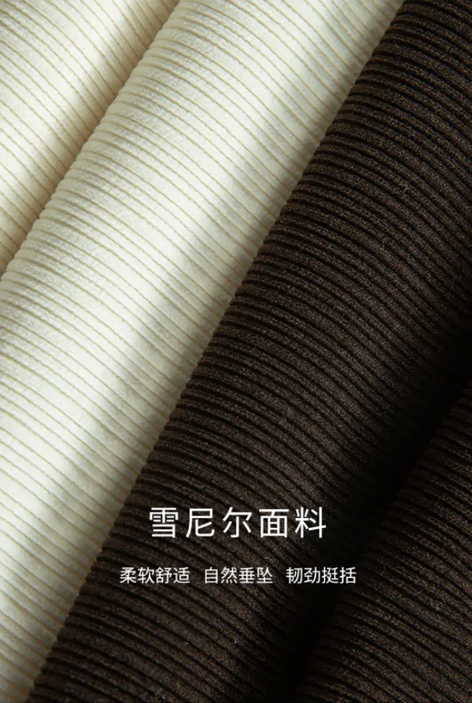 Shop里这条雪尼尔阔腿裤先在分量上给人强心剂,面料有天鹅绒般的触感,微微的光泽与滑感也能避免廉价,裤型挺阔垂坠,阔腿松弛有度。竖向坑条在视觉上也有一定的拉伸作用,对于担心白裤子显胖显爱的报友来说,会是个不错的尝新选择。