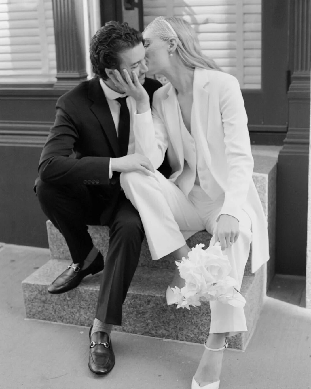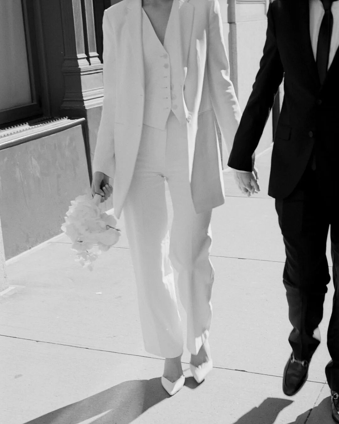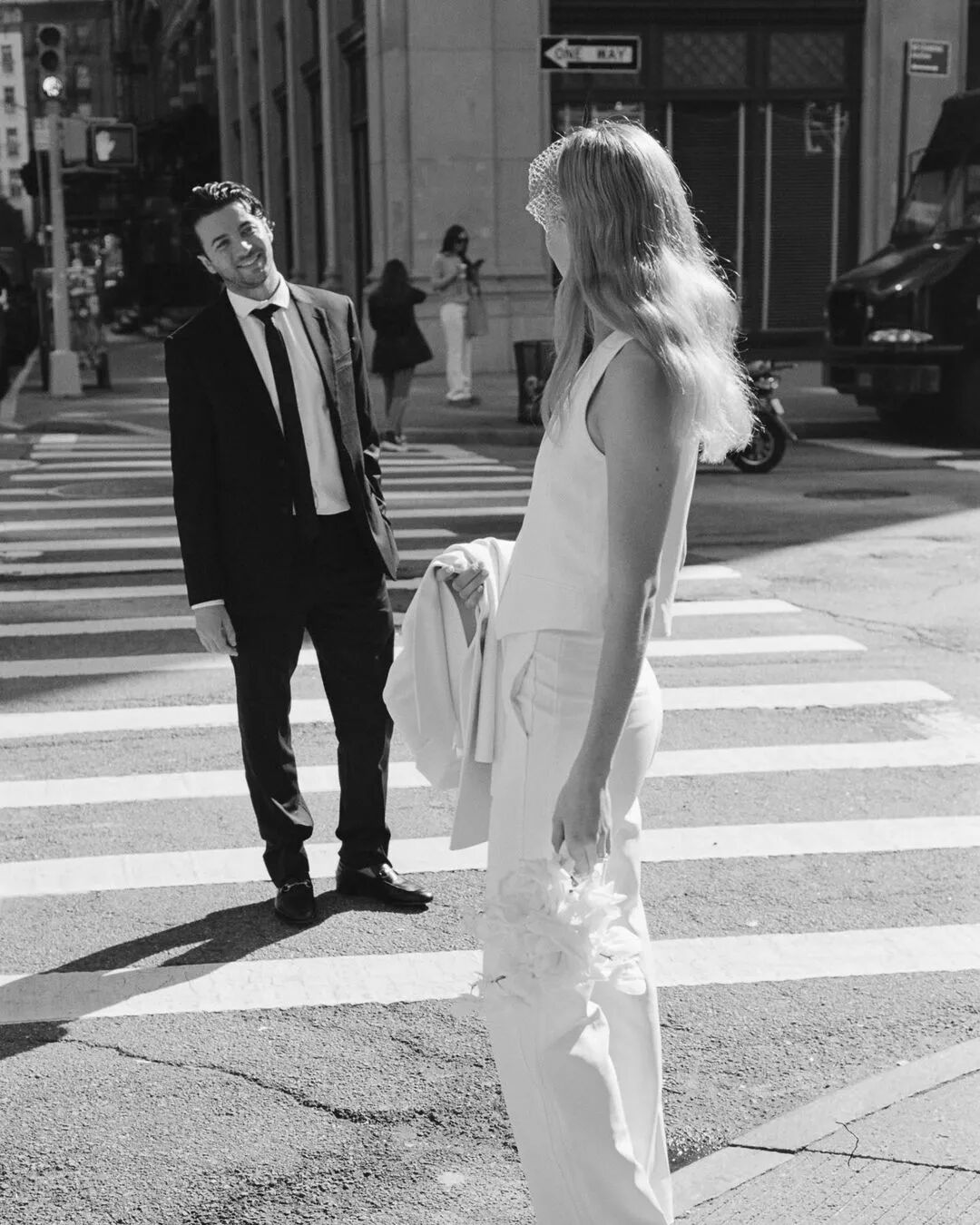 所以,在极为重要且体现个人风格的婚礼上,她才会坚持选择简洁的中古时装,而不是“只穿一次”的华丽礼服。更何况,这套潇洒的白色西装对她来说可太方便了,仪式完成之后,可以直接跟爱人去附近酒吧喝一杯庆祝!![]()