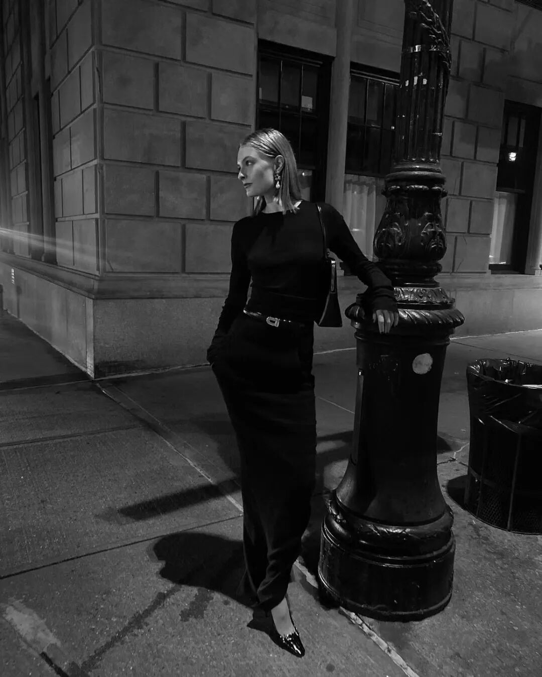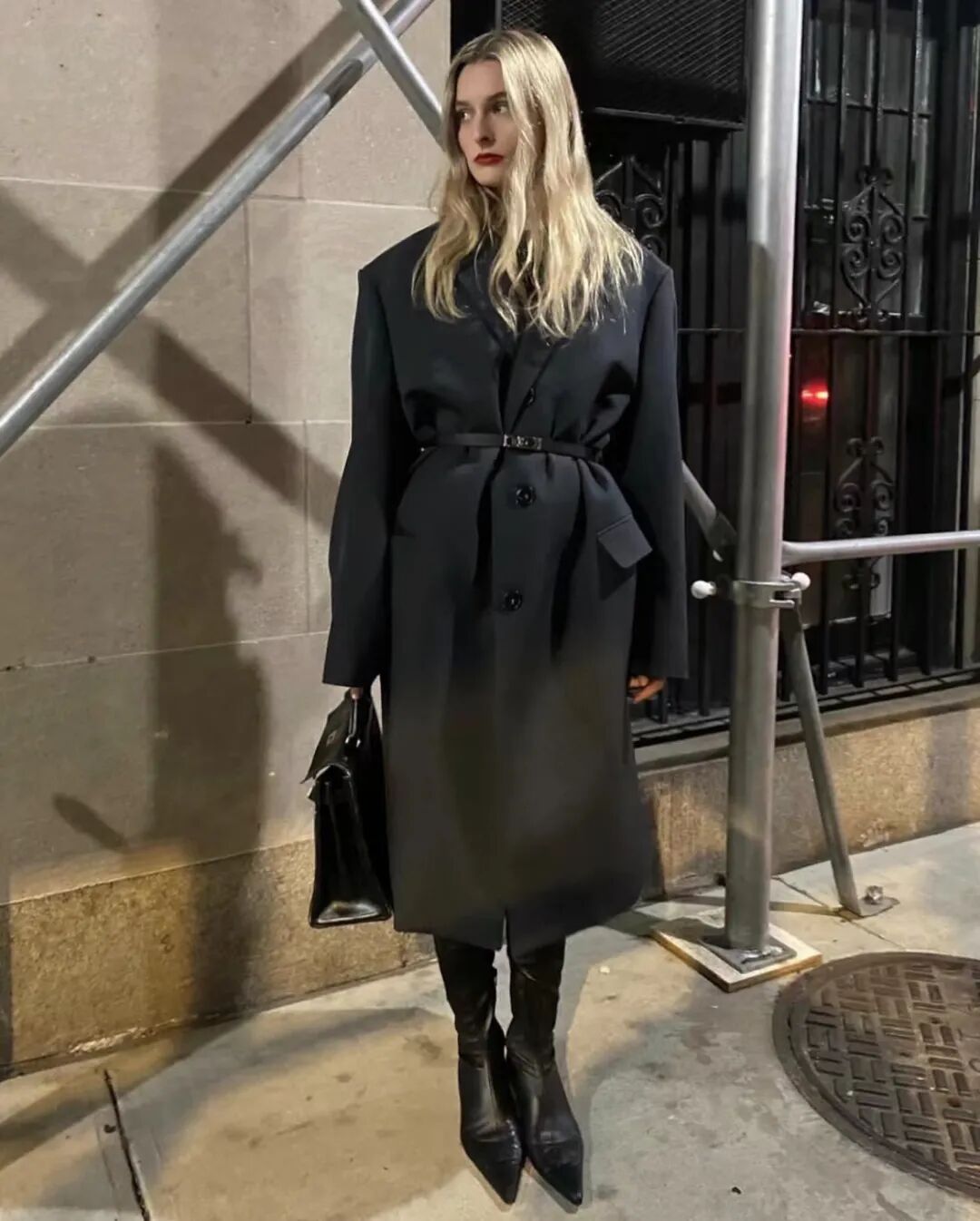 还有这条Stella McCartney金属扣皮带,也是“调节”穿搭气氛的高手。金银色的装饰扣摩登而醒目,比普通皮带更多了一重装饰性在。可以系在黑色大衣、西装或连衣裙外,请参考Christie的街拍⬆️。![]()