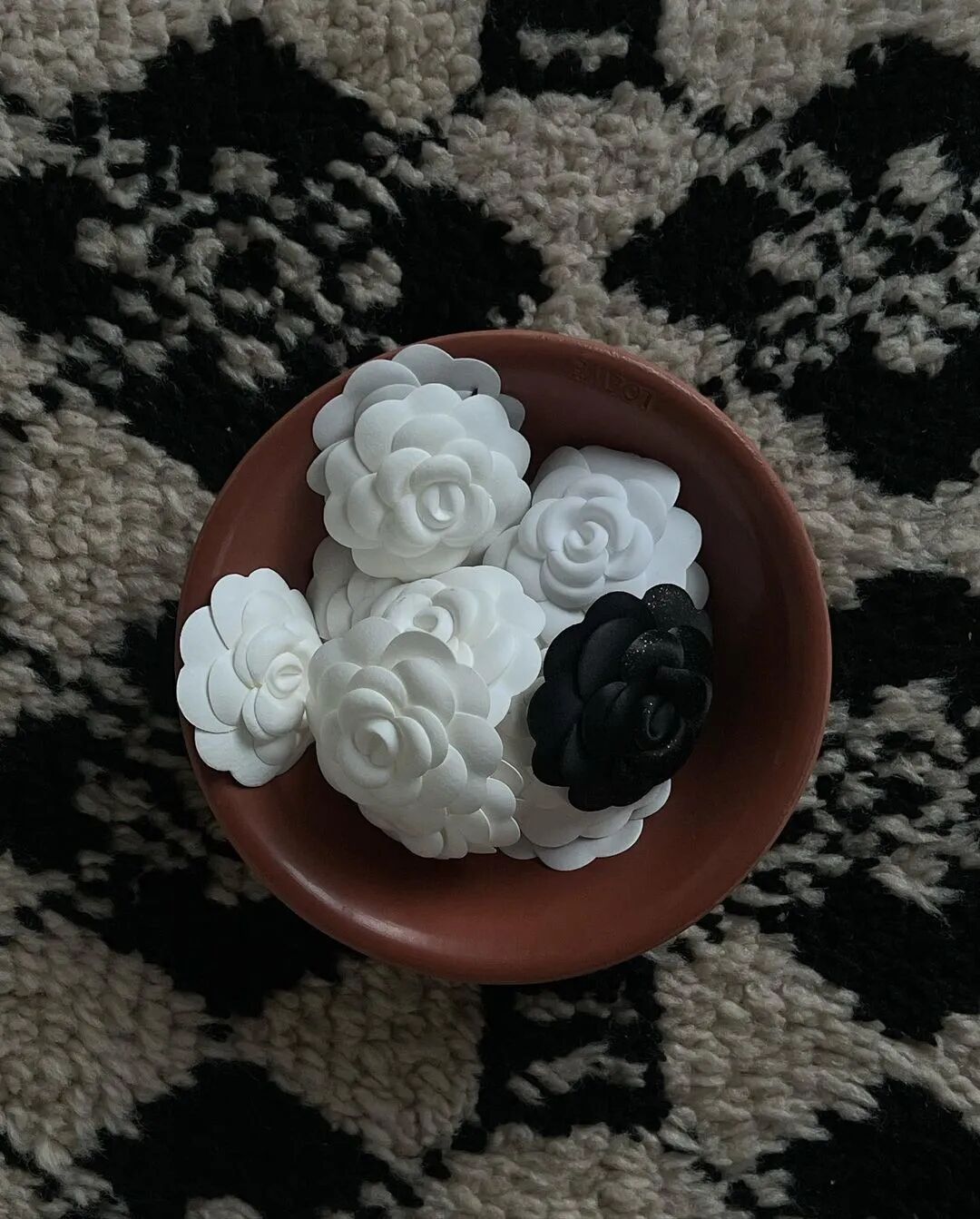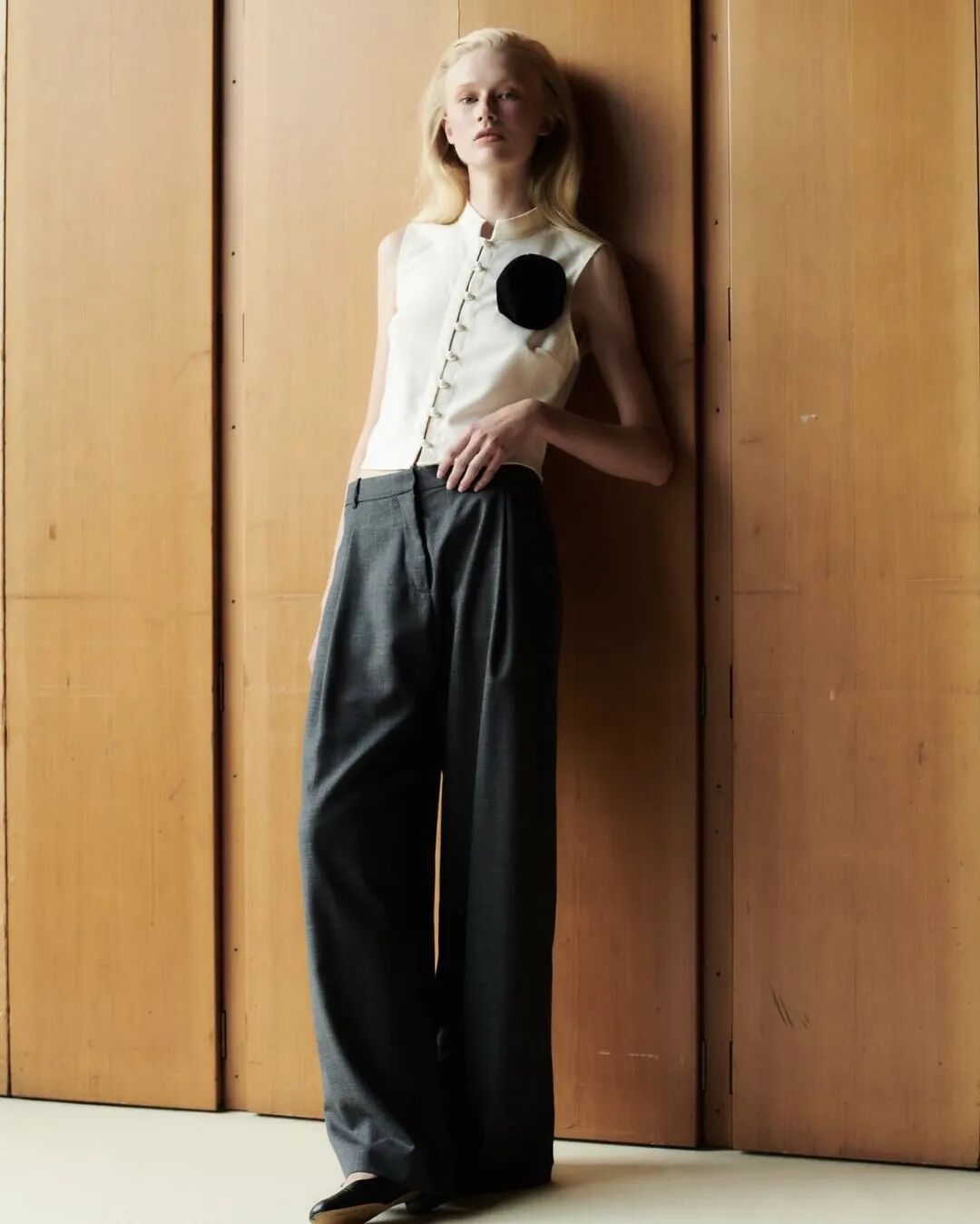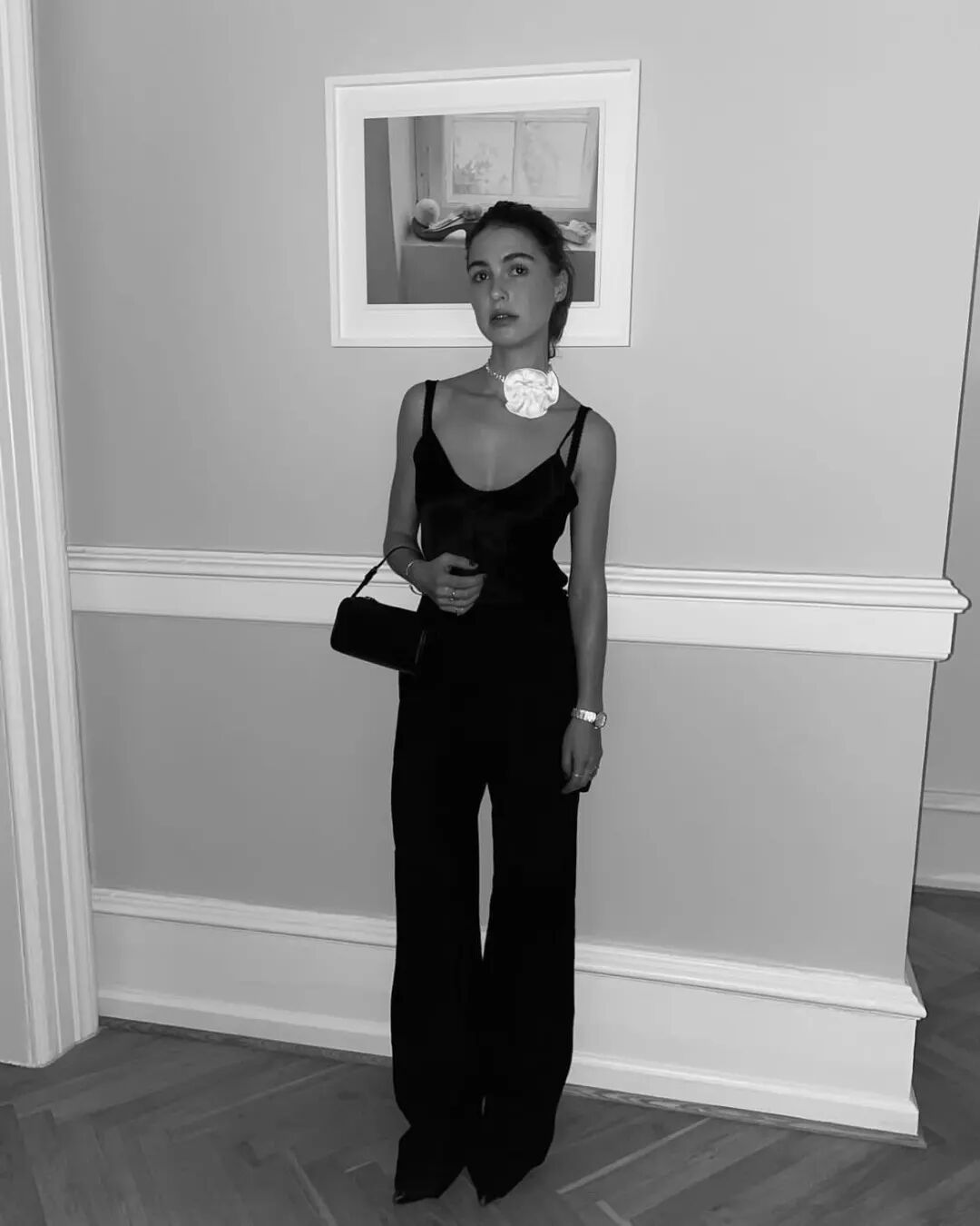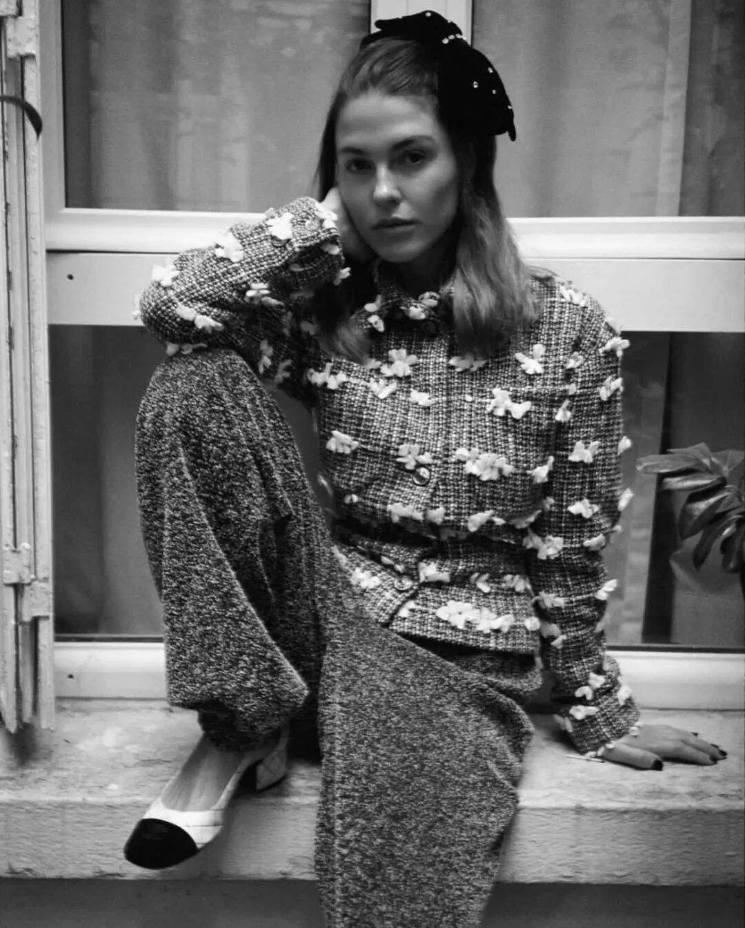 或是用一双可爱的Miu Miu芭蕾鞋,打破套装的拘谨,顿时生出几分俏皮感。蝴蝶结也是Sophia爱用的装饰元素,带一点甜美,一点复古,让夹克的酷与她本身的“甜”之间找到一个平衡。作为忠实的Chanel拥趸,Sophia每次买包、鞋,都会把包装上的山茶花留下来。它是一种绝佳的配饰,可以用细绳绑在脖颈上,当做时髦的chocker;或是别在秋冬外套的衣领上,也很显品位。在她和朋友共同创办的品牌The Garment,其2023春夏系列里,同样用针织玫瑰为简洁的时装做装饰。![]()