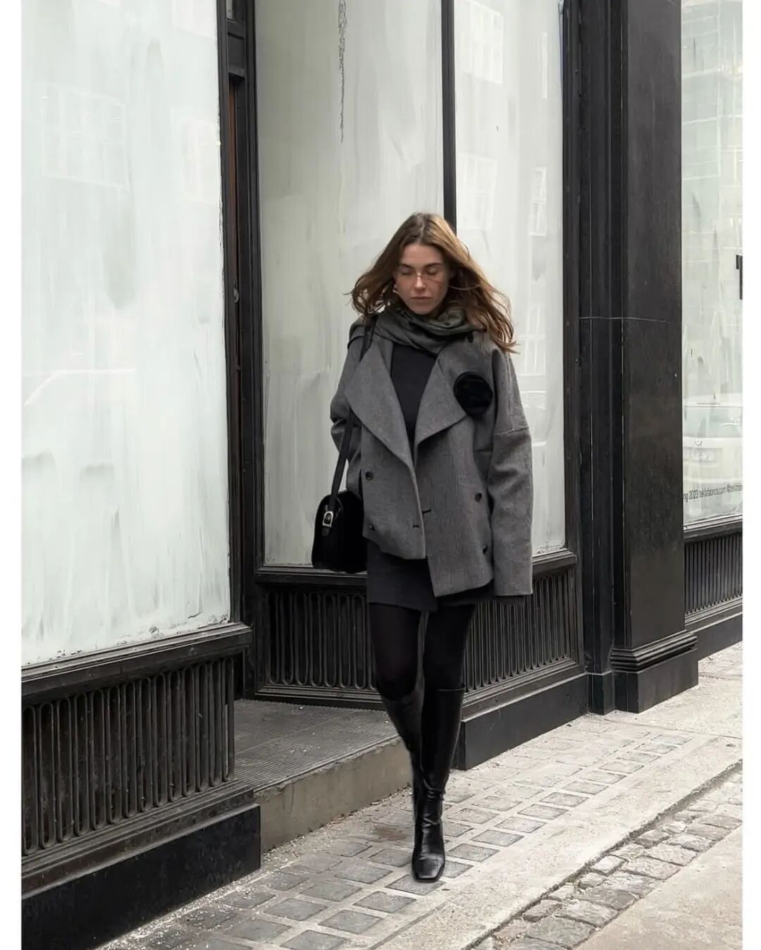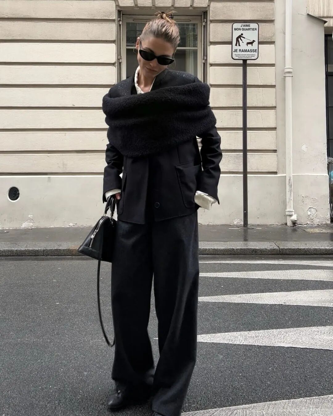 虽说她跟大多数北欧博主一样,把黑白灰作为自己的“本名色”。但除了用经典的中性色和极简廓形,为穿衣定上风格基调,我觉得她也很擅长在“基础”中制造一点有趣。比如,为利落的灰呢大衣、西装套上一个毛线围圈。除了增加暖意,也能作为一种新颖的配饰,让整个造型看起来不呆板,也更时髦了。![]()