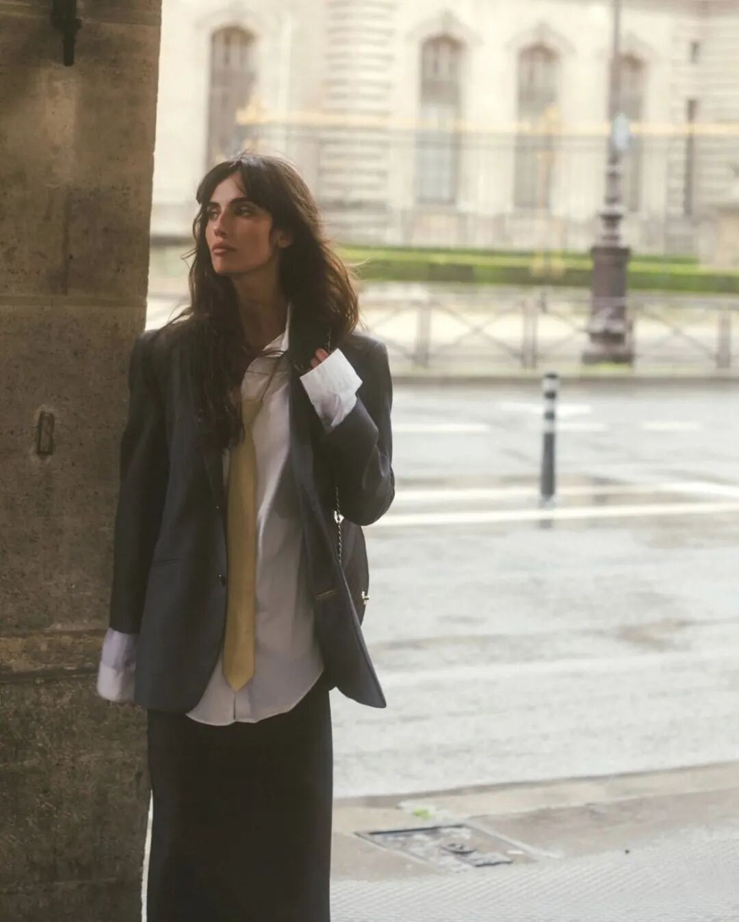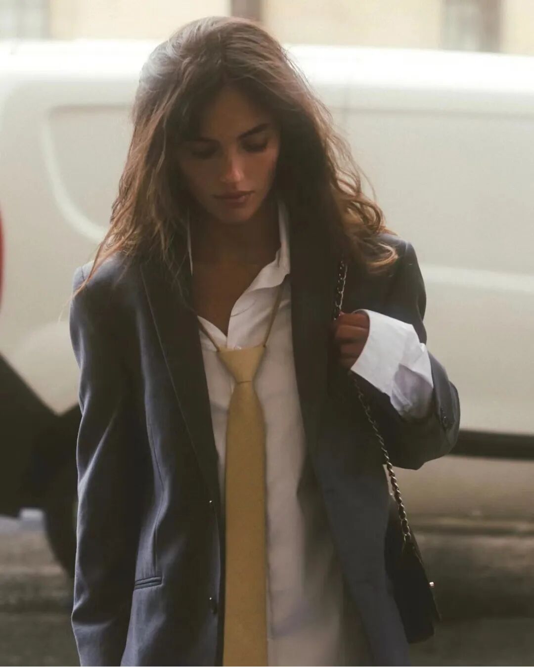不过在之前的文章里编辑提到的一个观点,或许可以部分性地解释“氛围感”:从关注具体的细节转变为追求整体的感觉。凌乱的发丝,松垮穿衬衫、西装,扯到半截的领带,甚至背后虚化的巴黎街景……很难用具体的词或风格来形容她的美,总之,就美得挺有氛围的吧。“氛围”与一个人的气质、穿戴以及周围的环境相关。体现出一种临场感,而非某种特定的风格,或是某个具体的单品。![]()