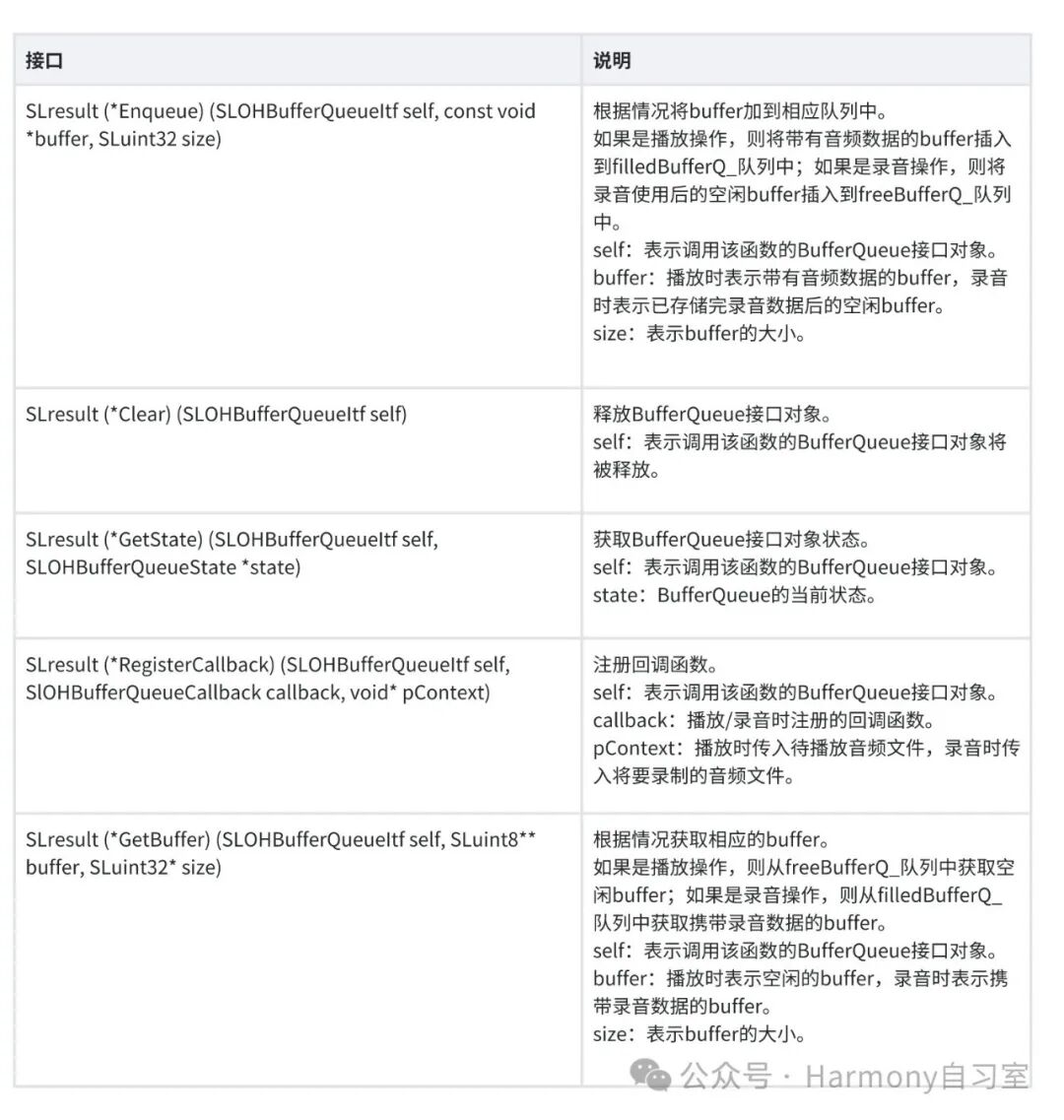 static void BufferQueueCallback (SLOHBufferQueueItf bufferQueueItf, void *pContext, SLuint32 size){SLuint8 *buffer = nullptr;SLuint32 pSize;(*bufferQueueItf)->GetBuffer(bufferQueueItf, &buffer, &pSize);// 将待播放音频数据写入buffer(*bufferQueueItf)->Enqueue(bufferQueueItf, buffer, size);}void *pContext; // 可传入自定义的上下文信息,会在Callback内收到(*bufferQueueItf)->RegisterCallback(bufferQueueItf, BufferQueueCallback, pContext);