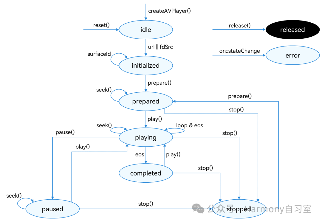 7. 退出播放:调用release()销毁实例,AVPlayer进入released状态,退出播放。