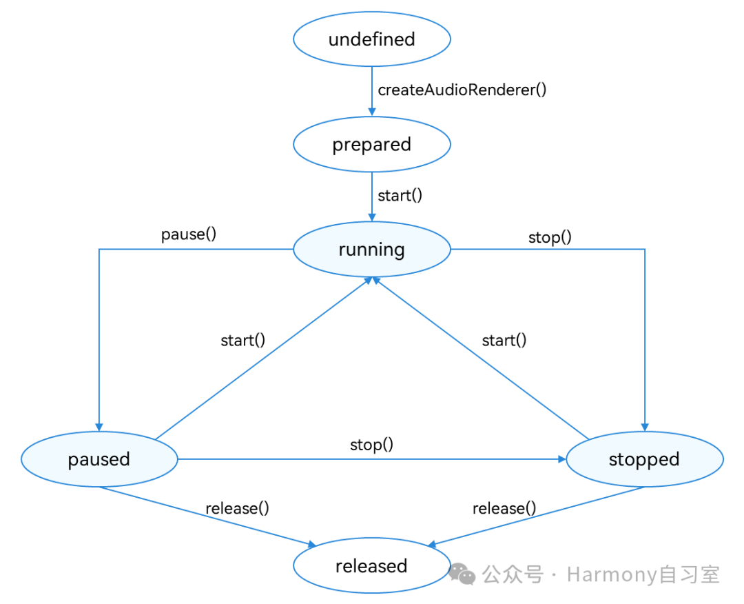 为保证UI线程不被阻塞,大部分AudioRenderer调用都是异步的。对于每个API均提供了callback函数和Promise函数,以下示例均采用callback函数。AudioRenderer状态变化示意图如下: