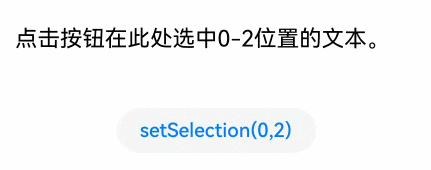 RichEditor(this.options).onReady(() => {this.controller.addTextSpan('点击按钮在此处选中0-2位置的文本。', {style: {fontColor: Color.Black,fontSize: 15}})}).width(300).height(60)Button('setSelection(0,2)', {buttonStyle: ButtonStyleMode.NORMAL}).height(30).fontSize(13).onClick(() => {this.controller.setSelection(0, 2)})