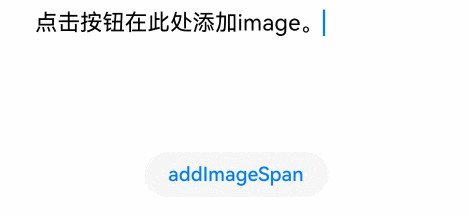 RichEditor(this.options).onReady(() => {this.controller.addTextSpan('点击按钮在此处添加image。', {style: {fontColor: Color.Black,fontSize: 15}})}).width(300).height(100)Button('addImageSpan', {buttonStyle: ButtonStyleMode.NORMAL}).height(30).fontSize(13).onClick(() => {this.controller.addImageSpan($r("app.media.startIcon"), {imageStyle: {size: ["57px", "57px"]}})})