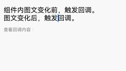 RichEditor(this.options).onReady(() => {this.controller.addTextSpan('组件内图文变化前,触发回调。\n图文变化后,触发回调。', {style: {fontColor: Color.Black,fontSize: 15}})}).onWillChange((value: RichEditorChangeValue) => {this.controller1.addTextSpan('组件内图文变化前,触发回调:\n' + JSON.stringify(value), {style: {fontColor: Color.Gray,fontSize: 10}})return true;}).onDidChange((rangeBefore: TextRange, rangeAfter: TextRange) => {this.controller1.addTextSpan('\n图文变化后,触发回调:\nrangeBefore:' + JSON.stringify(rangeBefore) + '\nrangeAfter:' + JSON.stringify(rangeBefore), {style: {fontColor: Color.Gray,fontSize: 10}})return true;}).width(300).height(50)Text('查看回调内容:').fontSize(10).fontColor(Color.Gray).width(300)RichEditor(this.options1).width(300).height(70)