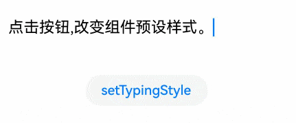 RichEditor(this.options).onReady(() => {this.controller.addTextSpan('点击按钮,改变组件预设样式。', {style: {fontColor: Color.Black,fontSize: 15}})}).width(300).height(60)Button('setTypingStyle', {buttonStyle: ButtonStyleMode.NORMAL}).height(30).fontSize(13).onClick(() => {this.controller.setTypingStyle({fontWeight: 'medium',fontColor: Color.Pink,fontSize: 15,fontStyle: FontStyle.Italic,decoration: {type: TextDecorationType.Underline,color: Color.Gray}})})