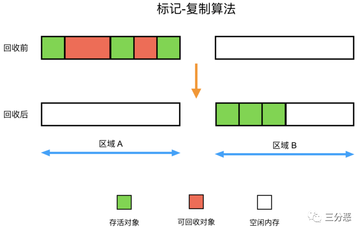 新生代垃圾收集主要采用这种算法,因为新生代的存活对象比较少,每次复制的只是少量的存活对象。