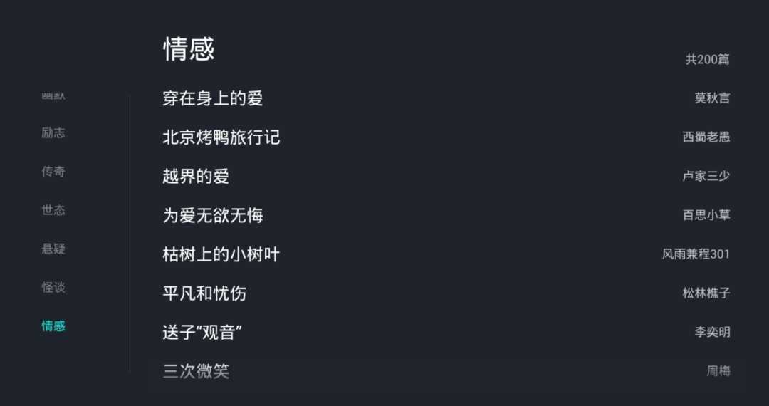 今天小编就给大家带了一款之前从未分享的“盒子读书”神器:熊猫听书TV,它集合了:小说、杂志、有声小说而且全部免费,这类资源真的不可多得哦。