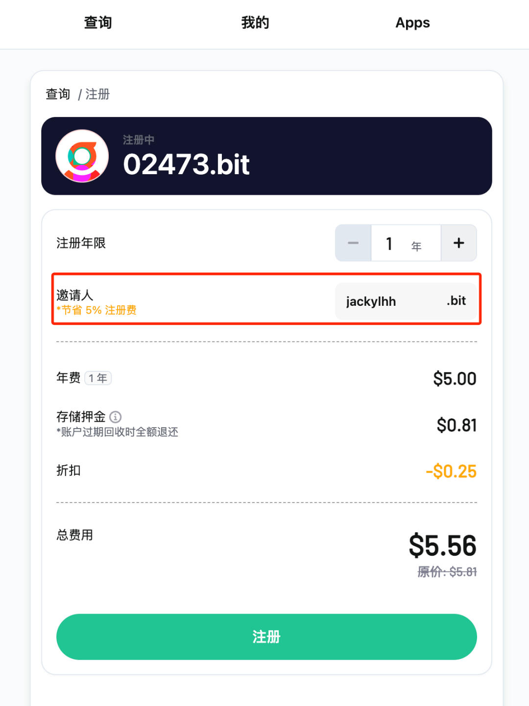 记得填写邀请人的 .bit 账户名(此邀请人必须是 DigitDAO 的成员,这样才能让你注册的纯数字 .bit 账户获得注册费返还)。如果你不认识 DigitDAO 的成员,可以在邀请人一栏填写字节君的账户名 jackylhh ,因为字节君已经是其中的成员了。