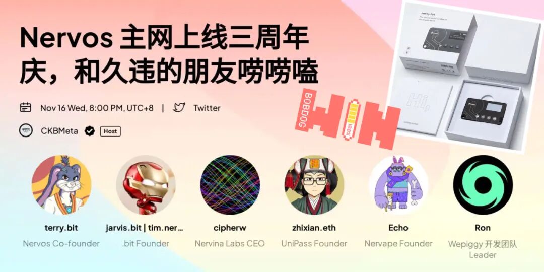 11 月 16 日 20:00(UTC+8),Nervos 字节元宇宙联合 CKBFans,在 Twitter Space 举办了一场主题为 “Nervos 主网上线三周年庆,和久违的朋友唠唠嗑” 的活动。