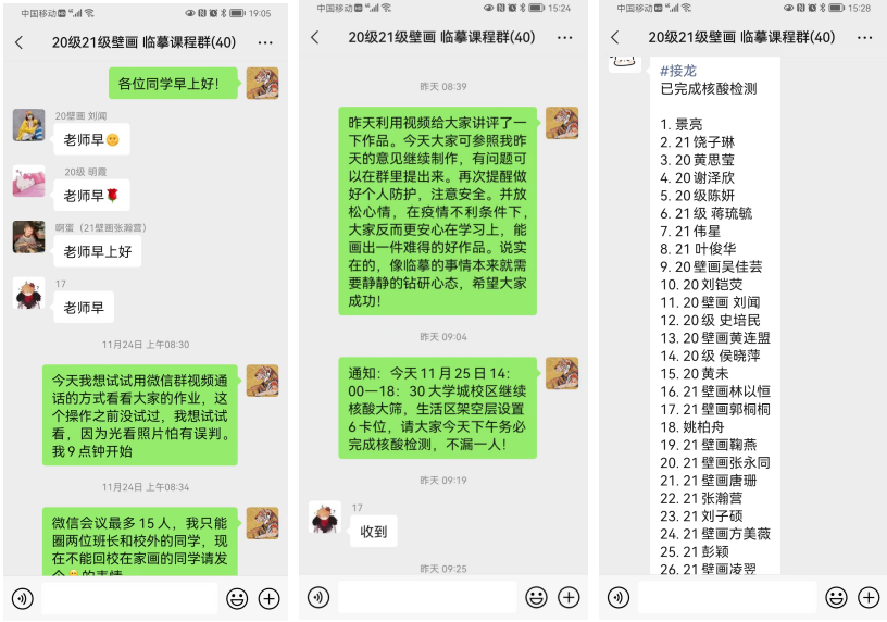 为了让学生保持良好的学习状态,保障学生的身心安全及维护正常的课程纪律,每天任课老师都会以亲切的问候和提醒作为点名的方式,以接龙的方式检查学生的核酸检测情况。