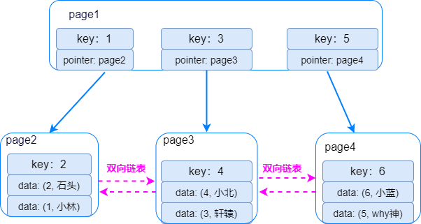 key=1 数据行(1,小林)不符合。key=2 符合,读取数据行(2, 石头)key=3符合,读取数据行(3,轩辕)。数一数上面的5个步骤有几个「加载磁盘页」字眼,5个,还记得上面我们说的:**加载磁盘数据非常费时!**这种随机大量的磁盘IO造成了B树索引的的性能瓶颈,使其与innoDB索引无缘。