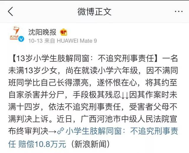 2012年,广西一13岁少女,因不满同学比自己漂亮,将其约到家里残杀后,将其肢解。