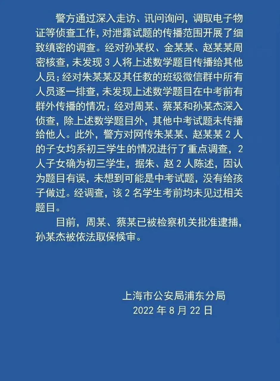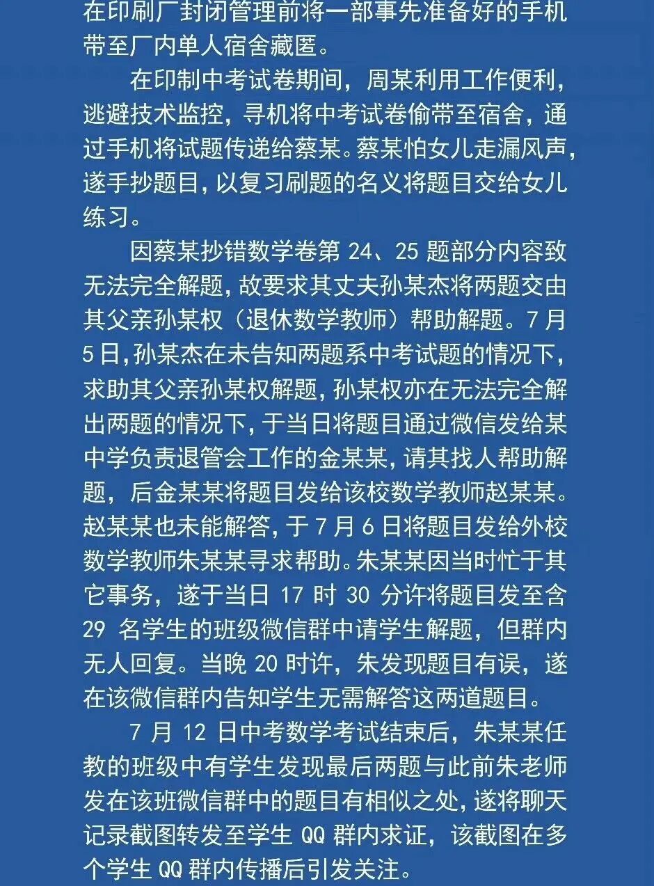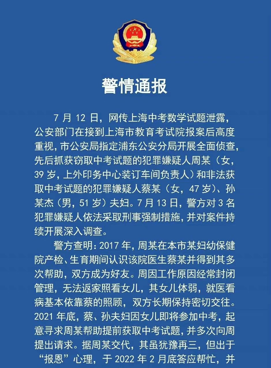 有两道大题,和他几天前在班级微信群里见过的几乎一模一样。如此重要的考试,如此秘密的试卷,为什么会有人提前拿到题目?那时,上海一家印刷厂的装订车间负责人周某要生小孩了。在产检、生娃的时候,她认识了上海某妇幼保健院的医生蔡某。周某的印刷厂,经常印刷保密资料,她也经常在单位封闭管理,没法回家照看女儿。蔡某知道中考试卷在周某那里印,就想让她帮忙搞中考题。犹豫再三,出于“报恩”心理,今年2 月,她答应帮忙。随后,在印刷厂封闭管理前,她把一部手机藏在了厂内的单人宿舍。等厂子开始印刷中考试卷,她避开监控,偷偷把试卷带回宿舍,用手机拍照后,传给了蔡某。就这样,女儿要中考的蔡某,居然顺利拿到了中考数学卷!怕女儿走漏风声,自己把试卷手抄了一遍,以复习刷题的名义,让女儿练习。她抄题的时候,把最后两道大题抄错了(一道是把b抄成了6,另一道是把条件抄错了地方)。蔡不敢找别人做题,就让老公拿着这两道题,去求助公公,也就是女儿的爷爷。爷爷毫无防范意识,就把题发给了一个在中学工作的熟人,让对方帮忙找人解题。离奇的是,他也没有作罢,又拿着这两道该死的破题去求助另一个学校的数学教师朱某某。这位朱老师当时正忙,就顺手把这两道题,发到了班级微信群里,让学生解题。几个小时后,朱老师终于发现题目有误,就在微信群里告诉学生,不要解了。朱老师班里的学生意识到试卷最后两题,和此前朱老师发在该班微信群中的题目非常相似。周某所在的印刷厂,不但被责令停止所有涉密印刷业务,还开除、处理了一大批人。一、如果没有抄错题,这事是不是就天衣无缝地成功了?那么,这么恶劣的作弊行为,是不是就神不知鬼不觉地过去了?二、如果有人可以如此作弊而不为人知,那么还有没有其他的泄题者存在?我相信以现在各地对中高考的重视程度,泄露试卷的情况肯定不多。但就算凤毛麟角,也是对考生的极大不公,必须严查严惩。三、印厂的周某,为了朋友的孩子都可以铤而走险,那要是她自己的孩子中高考呢?长期在印厂工作的人,很可能熟知印刷试卷的流程,找到作弊的办法。而如果这份试卷对她极为重要,那就很难指望她能安守本分不动摇。最好的办法还是尽量完善流程,堵住漏洞,让企图作弊者无计可施。四、女孩在考数学卷的时候,有没有发现这就是妈妈给她做的那套手抄题?从蔡某夫妻俩那么执着地要解出最后两题的劲头看,前面的题目,他们也必定会要求女儿熟知答案。朱老师的学生,在群里见过错的题,都能意识到是中考泄题。中考不算是国家考试,根据以往的案子看,一般泄露中考试卷,都以“泄露国家秘密罪”判罚。一、那个千方百计为女儿铺路的妈妈,亲手堵死了孩子的路。上海考试院昨天通报,认定蔡某的女儿考试作弊,中考成绩无效。结果老老实实考完试,却被认定作弊,不但成绩无效,还被千夫所指。但她父母的计谋过了头,不但坑了孩子,还把自己搭进去了。如果要冒险,一定提前想清楚会不会害了孩子,能不能承担后果。不知这些年她悉心照顾周某母女,是否就是为了拿到女儿的中考题?要是用到偏门上,可能反而害自己栽进大坑,还不如不聪明。什么“不好意思拒绝”“对方盛情难却”“人家以前对我有恩”……大部分罪犯,其实都是心存侥幸,觉得能瞒天过海、逃脱惩罚,才去作恶。任何坏事,只要做了,就会留下痕迹,就有被发现的可能。有时你以为谋划得很周全了,但最后很可能出些意外状况,让你彻底败露。就像蔡某肯定不会想到,她百般保密的试卷,最后会一波七折地出现在别人的微信群里。这个社会,中考高考,都关乎一个孩子、甚至一个家庭的命运。但要是孩子学得不错,却因为别人作弊自己不作弊,而痛失大好前程,那真是情何以堪啊。谢谢你看完文章,还请文末点亮【赞】+【在看】+【转发】,让更多人看到。作者:李月亮,高人气作家,新女性主义者,扎实写字的手艺人。解读情感,透视人性,以理性和智慧陪万千女性成长。新书《好的人生,不慌不忙》当当网热卖中。微信公众号:李月亮(bymooneye)。转载请联系作者授权。