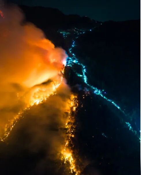 右侧幽蓝的灯光,是无数参与抗击山火的战士。