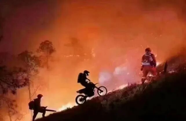 前面是漫天的山火和正在救火的消防员,而一台摩托车像“孤勇者”一样,向火场逆行......