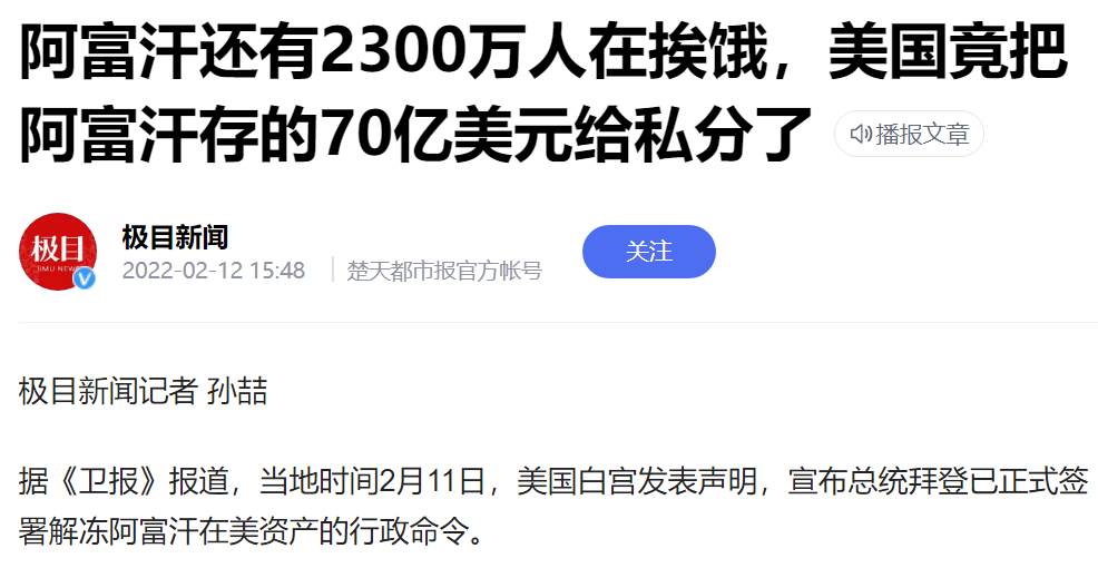 不过,美国干的这些坏事,中国都用小本本给记上了,并且在联合国经常要求美国赶紧把钱还给阿富汗,中国外交部发言人也经常要求美国赶紧还钱。或许,中国的要求并不能让美国还钱,但这至少证明两件事:一是阿富汗的70亿美元被美国私分了,美国欠阿富汗70亿美元;二是美国这些强盗行为会长期被中国宣扬,警示全世界不要信任美国,不要把钱存在美国,小心被没收。