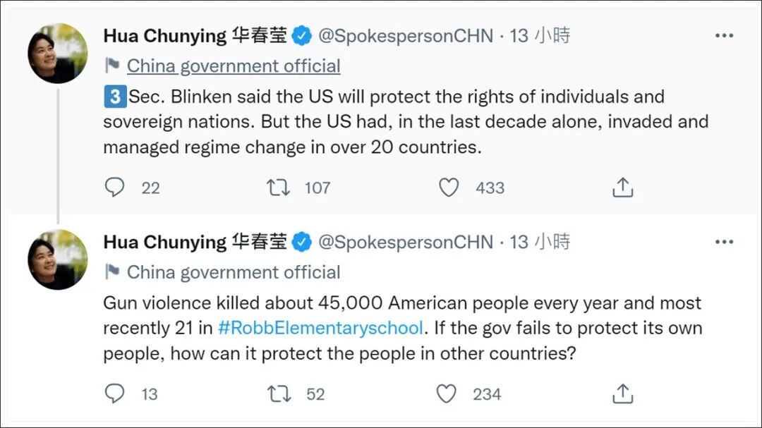 “布林肯国务卿说,美国将保护个人和主权国家的权利。但是,仅在过去十年中,美国就入侵了20多个国家并操纵其政权更迭。”第三组推文写道。华春莹还提到美国频发的枪击悲剧:“枪支暴力每年造成约4.5万美国人死亡,最近在罗布小学就有21人丧生。如果政府不能保护自己的人民,它又怎么能保护其他国家的人民呢?”