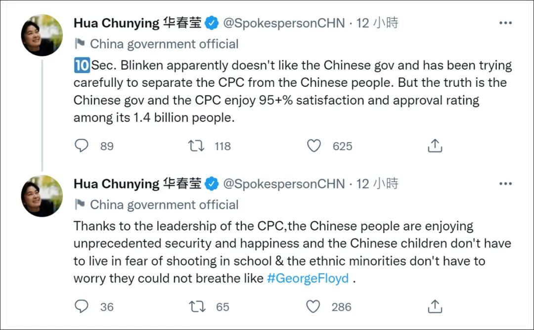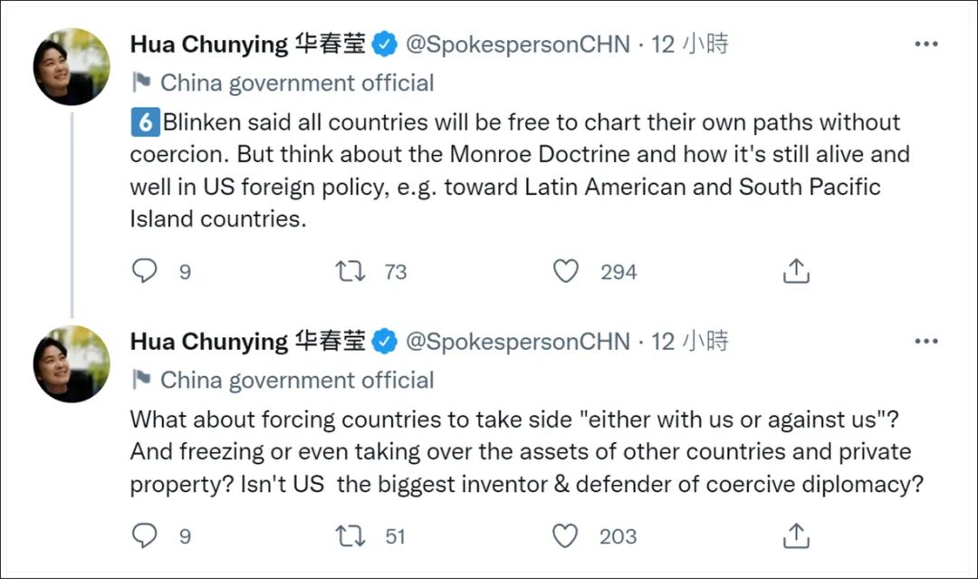 在第四组推文中,华春莹质问:“布林肯国务卿说,美国不会阻止中国发挥大国作用。如果真是这样,为什么美国一直在加强‘五眼联盟’,兜售‘四方安全对话’(QUAD),组建‘美英澳三边安全伙伴关系’(AUKUS),并加强在中国周边的双边军事同盟?美方为何从未停止干涉中国内政,从未停止支持新疆、西藏和台湾的分裂分子?”“布林肯国务卿说,美国并不寻求阻止中国......发展其经济或推进其人民的利益。如果是这样,为什么美国还未取消(对华)关税?为什么还在不遗余力地压制中国的高科技企业?为什么忙于在全球供应链中取代中国?为什么散布 ‘安全威胁’、‘强迫劳动’等谎言来剥夺中国人民和企业的发展权利?”在第五组推文中,华春莹继续质问道。“布林肯说,所有国家都将在没有胁迫的情况下自由规划自己的发展道路。但想想门罗主义,以及它如何依然在美国的外交政策中完好存在,例如对拉美和南太平洋岛国。”华春莹在第六组推文中讽刺道:“强迫其他国家在‘要么支持我们,要么反对我们’中选边站怎么样?冻结甚至接管其他国家的资产和私人财产?美国不是胁迫性外交的最大发明者和捍卫者吗?”在第七组推文中,华春莹写道:“布林肯国务卿说,中国让美国工人失去了数以百万计的工作岗位,对美国工人和企业造成了伤害。这又是(拿中国当)替罪羊。事实是,美国对华关税战使美国企业损失了1.7万亿美元,让美国损失了24万个工作岗位,让每个美国家庭每年损失1300美元!顺便说一句,他是否还会把美国政府未能控制枪支造成大量死亡的责任归咎于中国?”华春莹在第八组推文中提及人权问题:“关于人权,布林肯国务卿没有提到罗布小学校园枪击事件,难道美国政客的自私、冷漠、傲慢和无能不应该对这些可怕的悲剧负责吗?如果政府不能保护自己人民的生命,又如何能对其他国家的人权进行说教,并给予保护?”第九组推文华春莹谈到了美国的“一中政策”:“布林肯说美国的一中政策和中国的不同,要明确的是,‘一个中国’只有一个正确的版本,即世界上只有一个中国,台湾是中国的一部分,中华人民共和国是代表中国的唯一合法政府。这是美国政府在1979年签署的《中美建交联合公报》中承认的,也是此后所有美国政府承认的,这也是中国与包括美国在内的181个国家建立外交关系的政治前提。”“布林肯国务卿显然不喜欢中国政府,并一直小心翼翼地试图将中国共产党与中国人民区分开。但事实是,中国政府和中国共产党在其14亿人民中拥有95%以上的满意度和支持率。在中国共产党的领导下,中国人民享有前所未有的安全和幸福,中国的孩子们不必生活在校园枪击的恐惧中,少数民族也不必担心他们无法像乔治·弗洛伊德那样‘无法呼吸’。”华春莹在第十组推文中写道。最后,华春莹指出:“布林肯国务卿表示,美国将与中国进行建设性接触,这两个伟大的国家可以和平共处。嗯,我们以前听过这些话,并随时准备朝着合作共赢的方向而努力。听其言,更要观其行,美国是否能兑现这些承诺,我们拭目以待。”