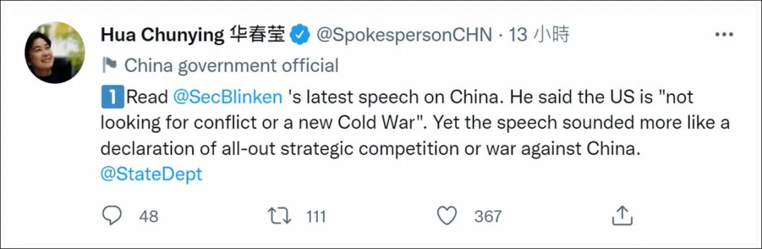 5月27日傍晚,中国外交部部长助理、发言人华春莹连发11组推文,逐一回击布林肯的讲话内容。