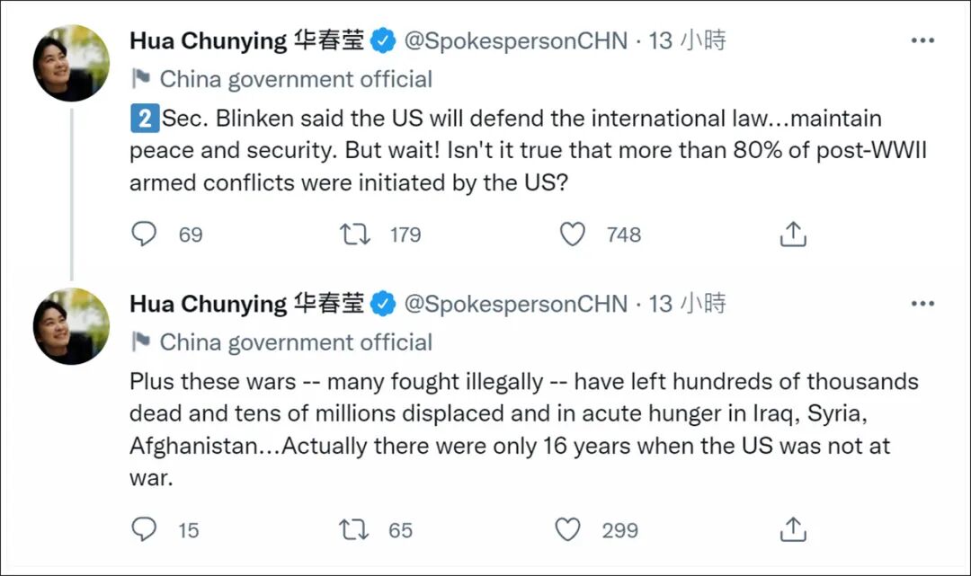 在第一组推文中,华春莹写道:“读了布林肯国务卿最新涉华演讲,他说美国‘不寻求冲突或新冷战’。然而,这番讲话听起来更像是针对中国发起全面战略竞争或战争的宣言。”“布林肯国务卿说,美国将捍卫国际法......维护和平与安全。但是,等等! 二战后80%以上的武装冲突不都是由美国发起的吗?”华春莹在第二组推文中写道,“再加上这些战争——许多是非法进行的——已在伊拉克、叙利亚、阿富汗造成数十万人死亡,数千万人流离失所并陷入严重饥荒......事实上,美国没有打仗的时间只有16年。”