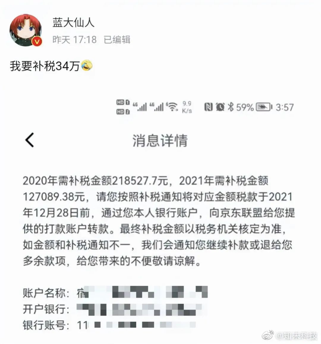 还有不少网络大V,都收到了数万至数十万不等的补税单。