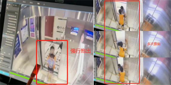 电梯升至23楼开了门,陈某曦强行把小宇抱出电梯。