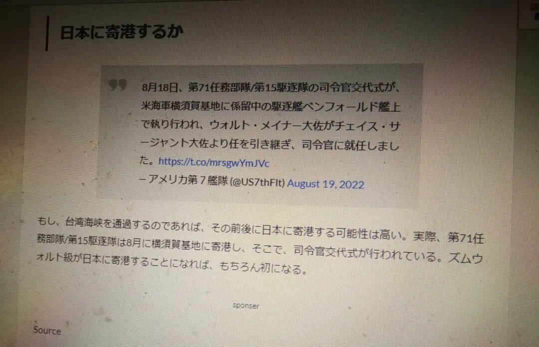 有日本媒体爆料称,其很可能直接来一次穿越台湾海峡的行动。“很有可能在过台海之前或者之后,停靠日本港口,其中,第71特遣部队/第15驱逐舰中队,刚在8月于横须贺基地完成长官交接仪式,如果‘朱姆沃尔特’号停靠日本,横须贺军港很可能是第一站”。