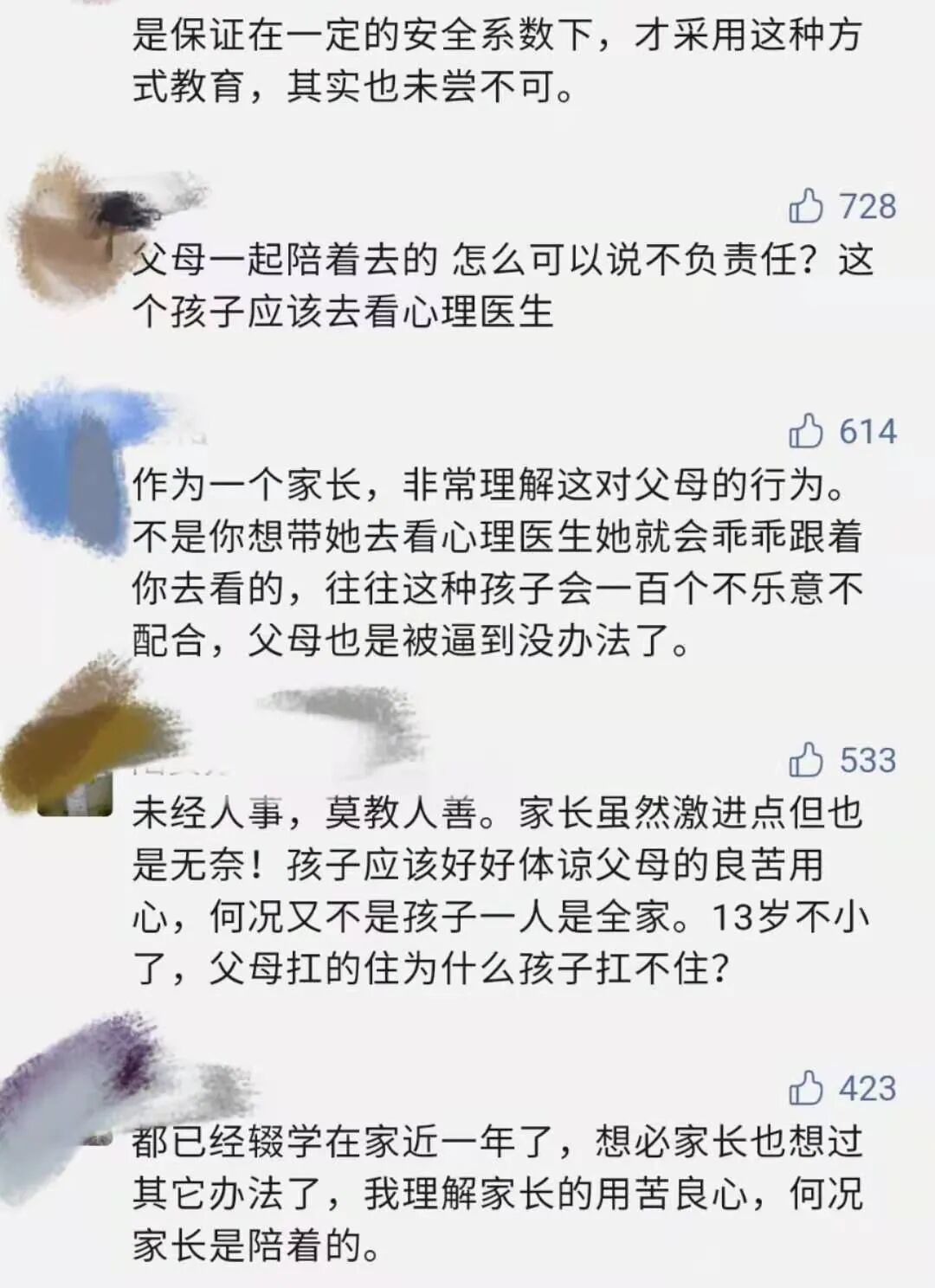 也有人认为这正是父母负责的表现。有网友表示,整个过程中,父母始终同孩子在一起,也准备了相应物资。也有网友对父母教育叛逆期孩子的这份无奈感同身受。