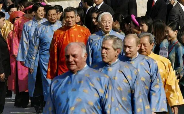 2006年河内APEC会议,各国领导人身穿奥黛准备合影当然,也有一些国际会议,并不是西装革履的。比较典型的是亚太经合组织(APEC)峰会,已经习惯穿着各个东道国的民族服饰。最初定下这么个穿法的时候,显示的是APEC并不是一个国际正式会议。1993年,首届APEC领导人非正式会议在美国召开,当时的美国总统克林顿穿着牛仔裤,十分随意。第二年,也就是1994年在印尼茂物开会的时候,时任印尼总统苏哈托为每位与会领导人送了一件蜡染印尼衬衣。此后,APEC会议主办国都会依照这个惯例,为领导人准备独具本国特色的民族服饰,这项传统一直延续到今天。![]()