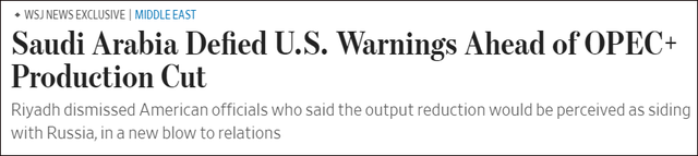 沙特在“欧佩克+”宣布减产前无视美国警告 图:《华尔街日报》报道截屏