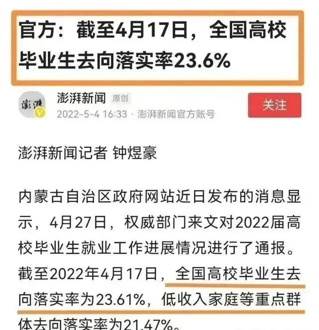 据国家统计局显示,2022年5月份,全国城镇调查失业率为5.9%,其中16-24岁青年人失业率达18.2%。按照46271万的城镇就业人口来计算,也就是说失业人数大约为2360万人。而随着毕业季的到来,大批毕业生涌入人才市场,就业难度持续增加。据教育部统计,2022年高校应届毕业生规模达1076万人,比去年增加了167万人。到4月中旬,46.7%求职毕业生获得Offer,签约率只有15.4%,毕业生去向落实率只有23.6%。也就是说,在“金三银四”的春招结束后,仍有四分之三的应届毕业生没有找到工作。![]()