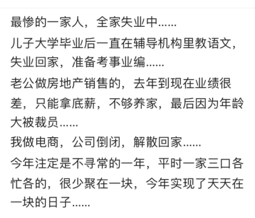 因为疫情的反复,实体经济越发艰难,大量的中小企业倒闭,大型工厂、企业元气大伤,外企撤走。例如教培行业实行“双减”政策,约有70万的教培机构和上千万的从业人员遭受打击。据保守估计,约有400到500万教培机构人员失业。