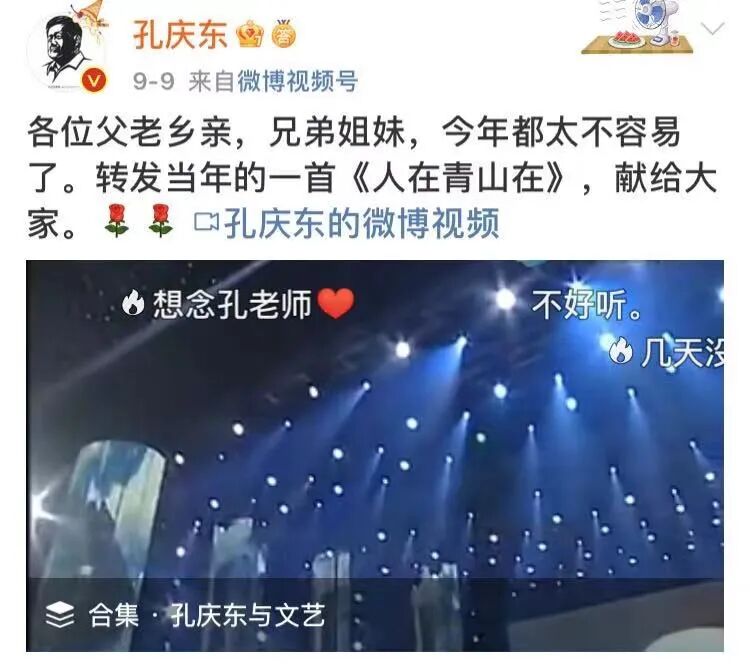 在这首歌的前面,孔庆东还特地加了按语:各位父老乡亲,兄弟姐妹,今年都太不容易了。转发当年的一首《人在青山在》,献给大家。